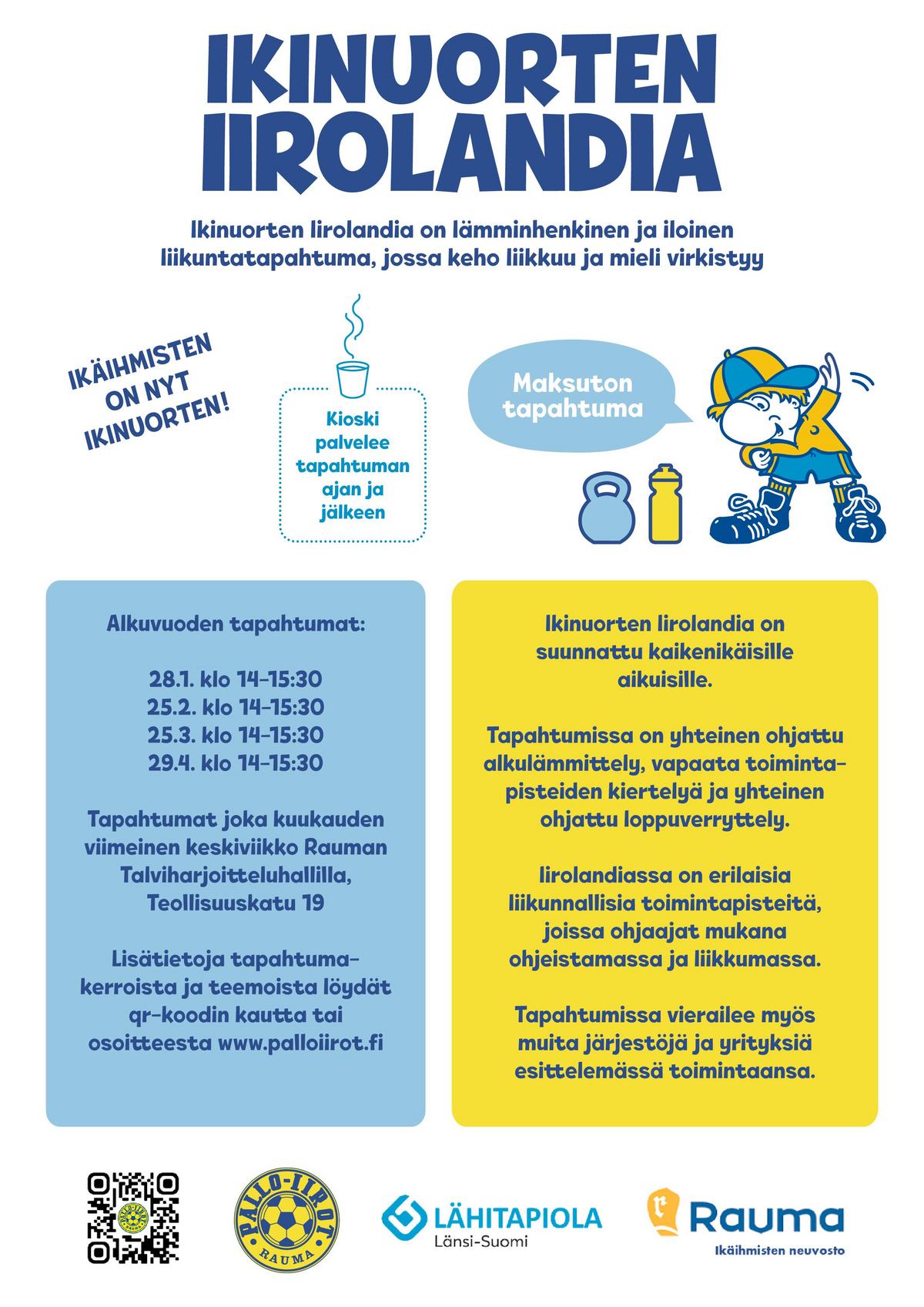 Ikinuorten Iirolandia tuttuun tapaan kuukauden viimeisenä keskiviikkona klo 14-15:30 Rauman Talviharjoitteluhallilla.
