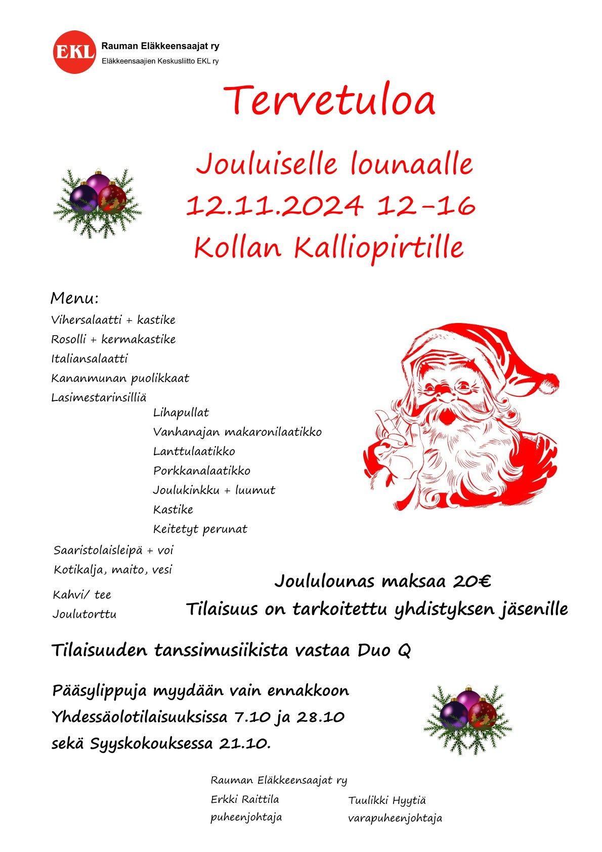 Joululounas Kollan Kalliopirtillä. Tilaisuus on tarkoitettu yhdistyksen jäsenille.